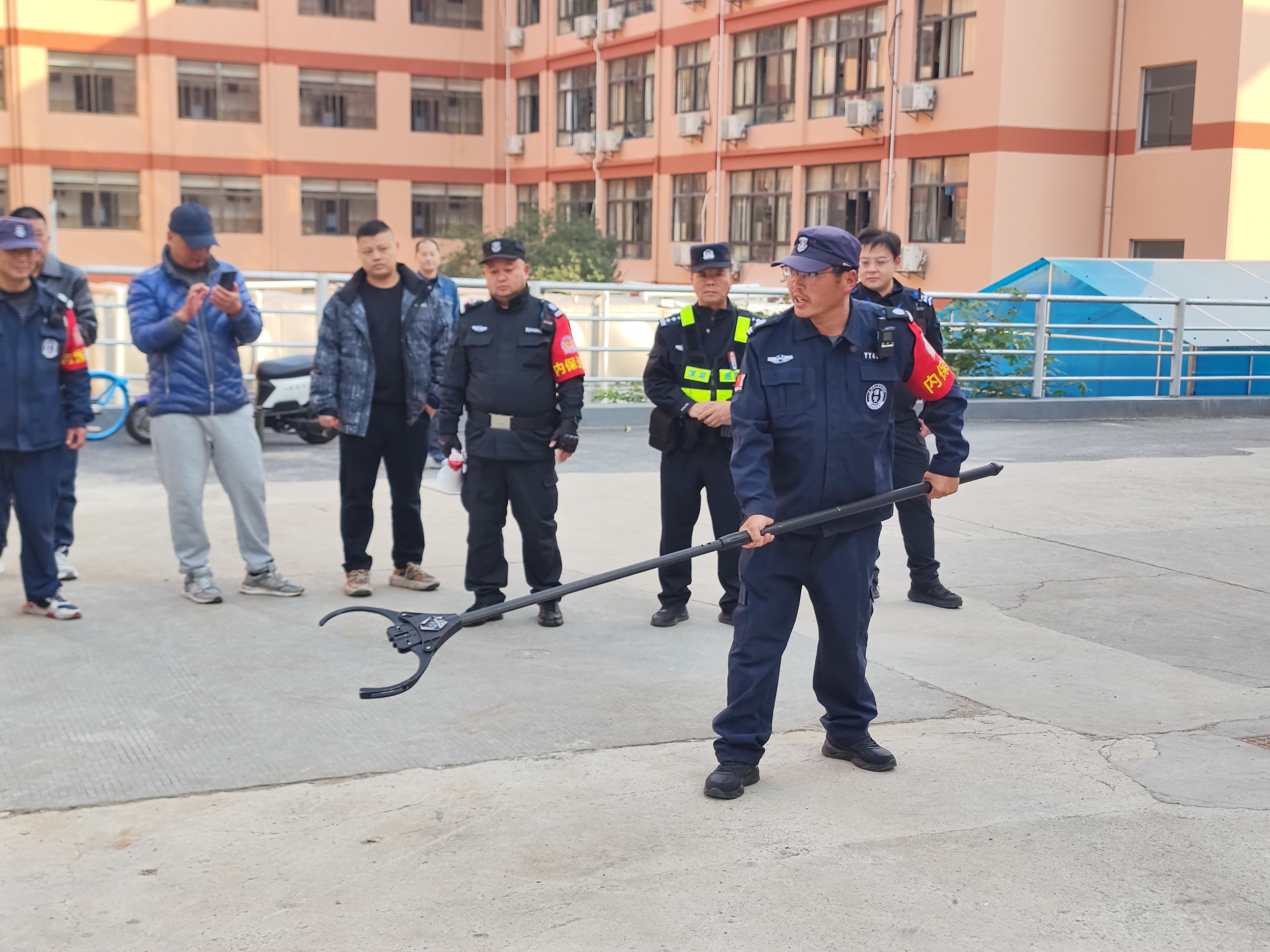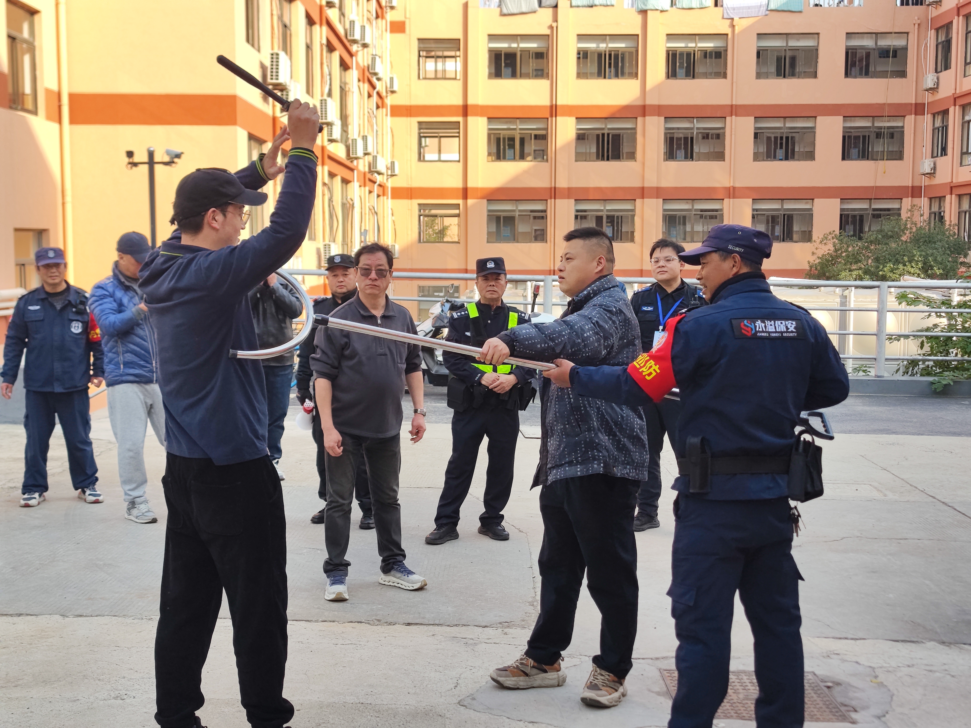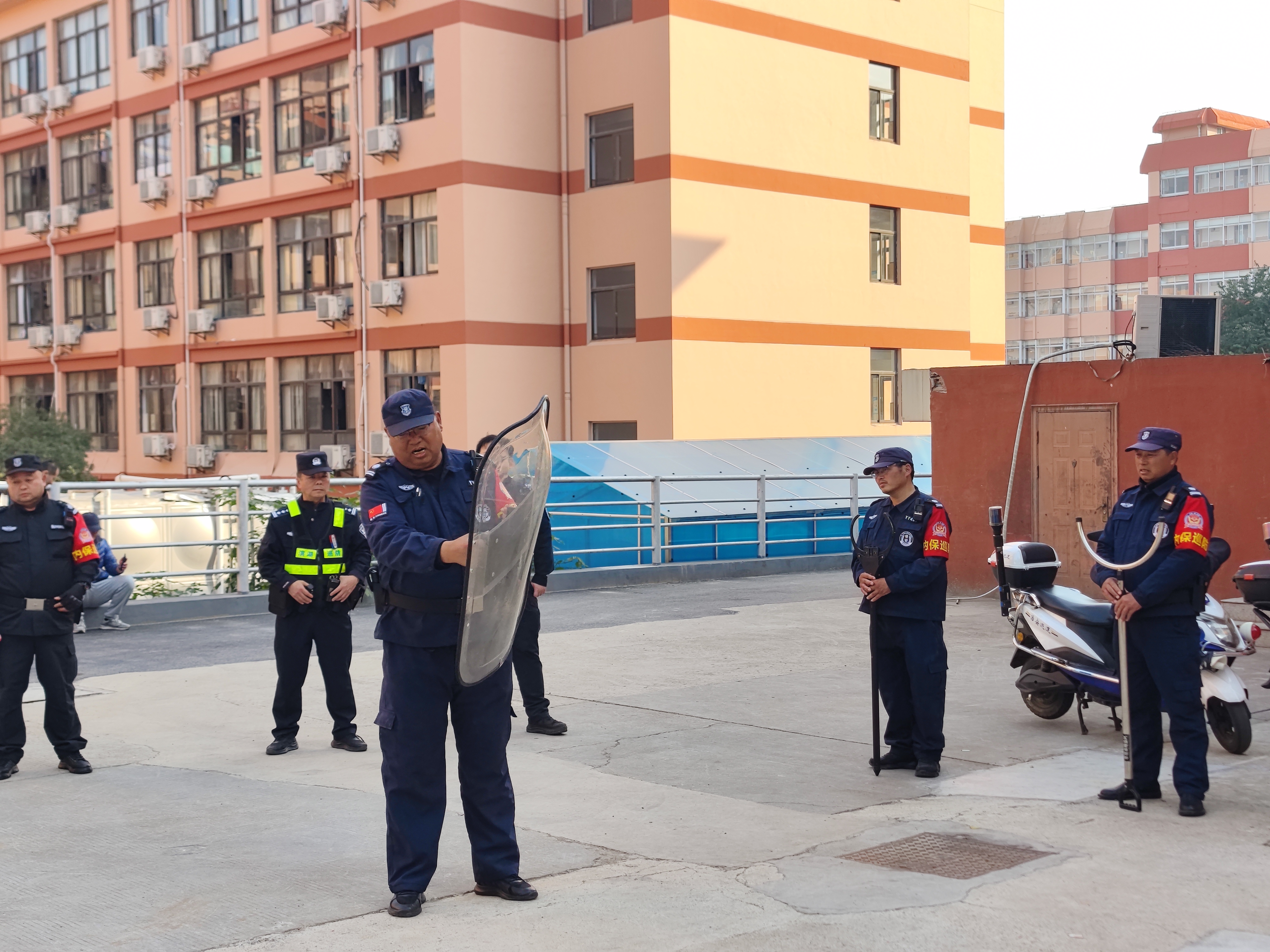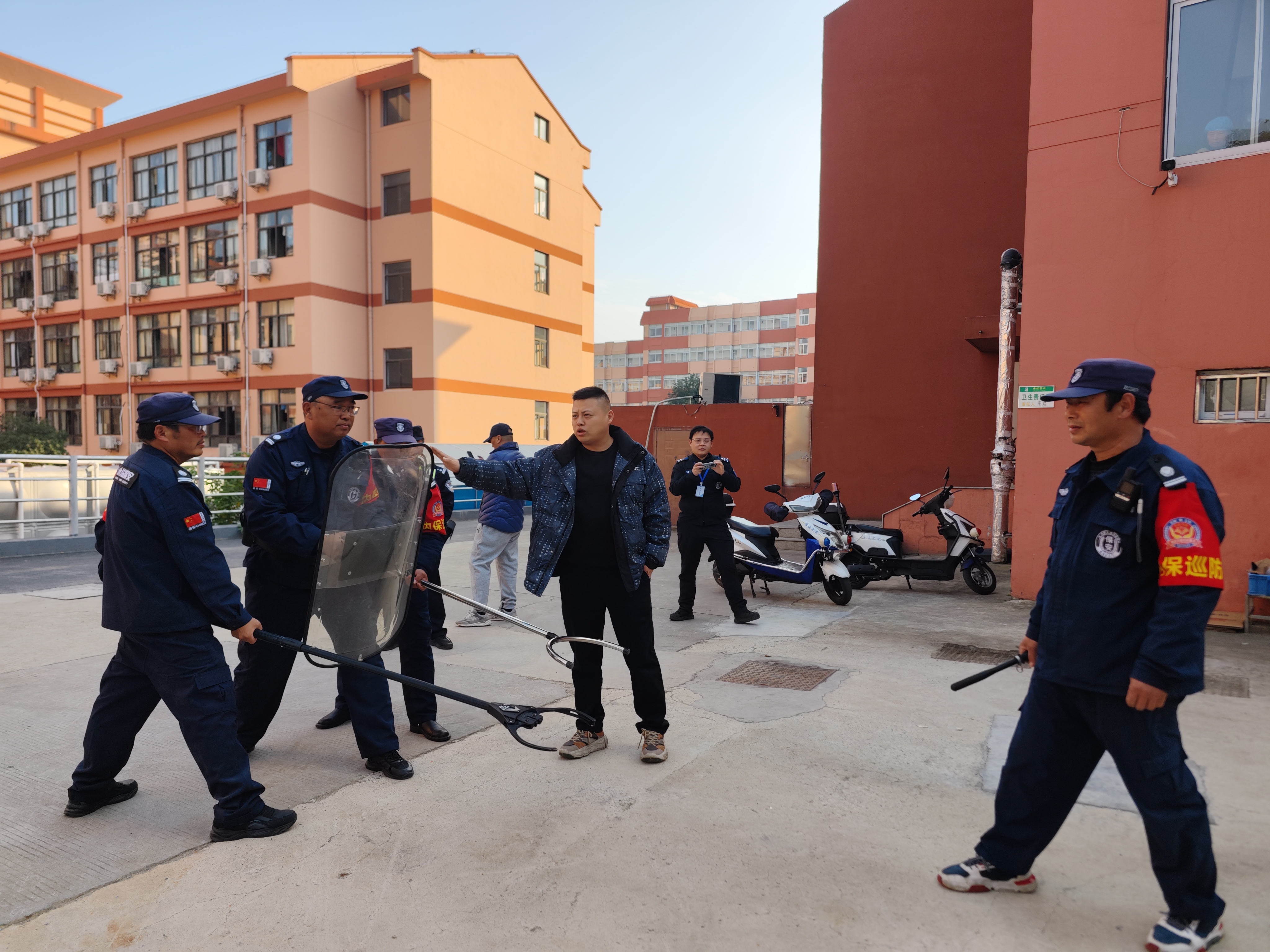 演练准备阶段,王处长首先明确本次活动是模拟“可疑人员”进入食堂区域试图实施不轨行为而进行。对手持防暴盾牌、钢叉等专业防暴器械的使用进行了讲解。随后食堂工作人员现场进行了防暴器械实操学习。通过安保人员的现场讲解与示范,大家熟练掌握了手持防暴盾牌、钢叉等器械的使用技巧,进一步提升了个人安全防护与应急处置能力。
